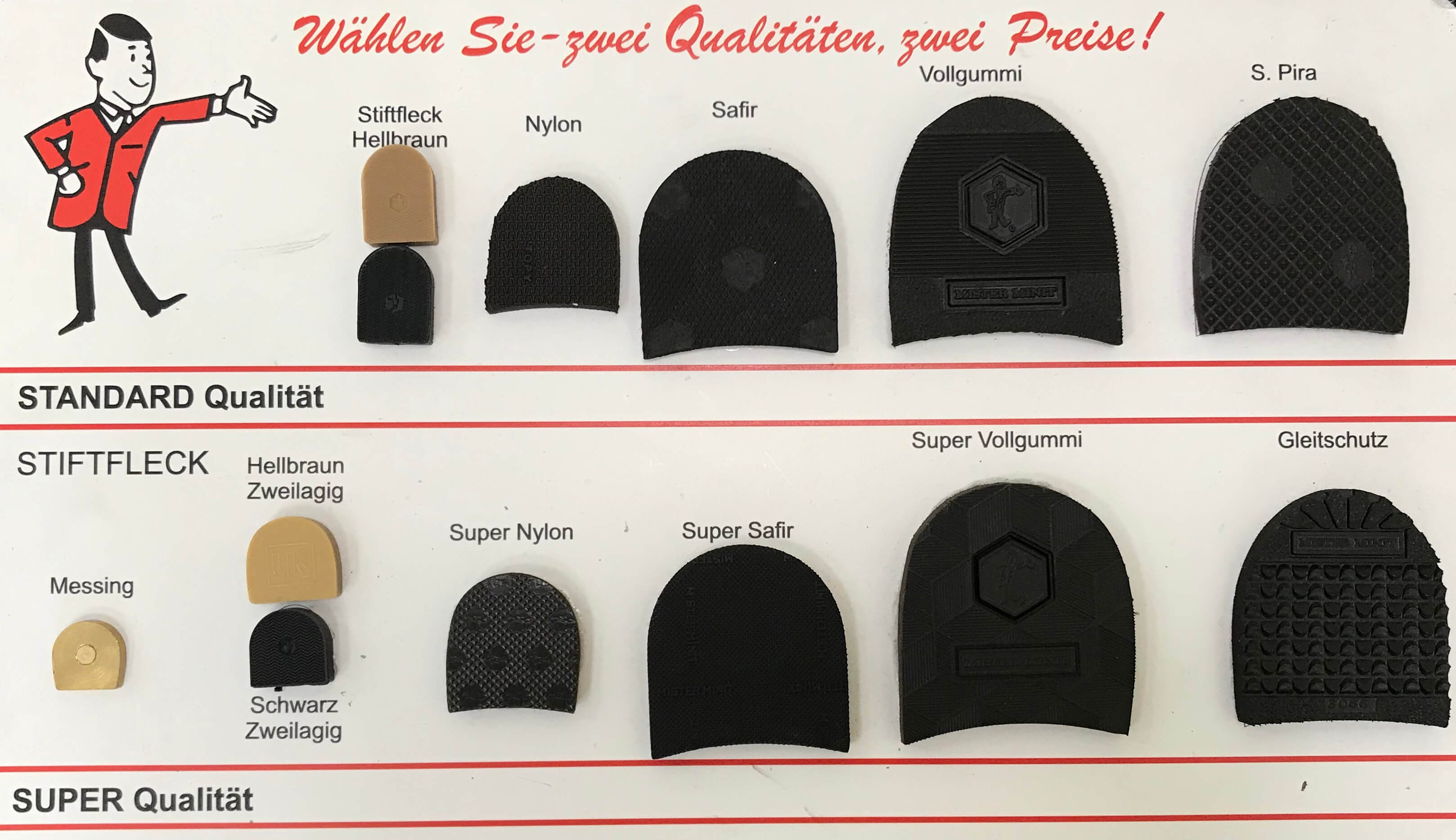 - „MISTER MINIT Super Qualität“: Höchster Komfort und Abriebfestigkeit für besonders starke Beanspruchung.