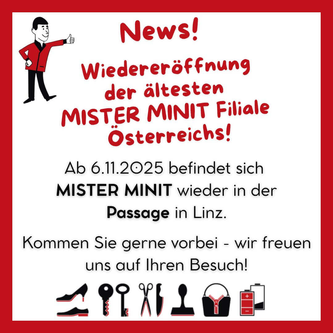 Nach erfolgreichem Umbau unserer Filiale in der Passage Linz freuen wir uns, ab 6. November 2025 wieder wie gewohnt für Sie da zu sein. Unsere temporäre Filiale im Atrium ist ab sofort geschlossen – ab November erleichtern wir Ihnen die kleinen Herausforderungen des Alltags wieder an ihrem angestammten Platz: in der ältesten MISTER MINIT Filiale Österreichs in der Passage.